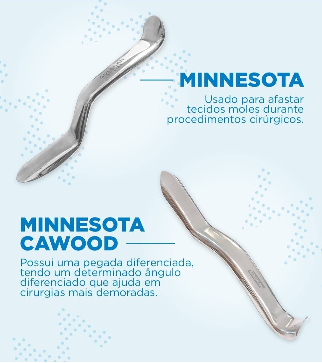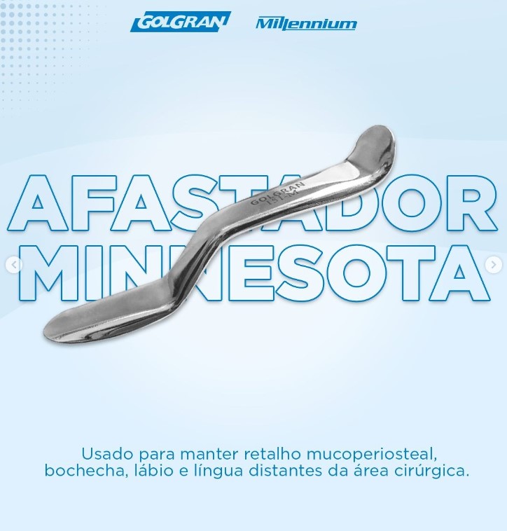 O AFASTADOR MINESSOTA - GOLGRAN é usado para manter retalho mucoperiosteal, tecidos moles, bochecha, lábio e língua distantes da área cirúrgica