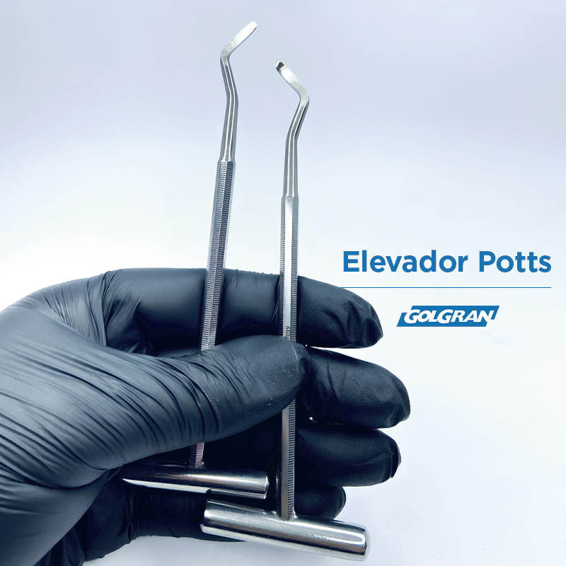 O Kit Elevador Potts Golgran é composto por dois instrumentos cirúrgicos odontológicos — direito e esquerdo — desenvolvidos para auxiliar na luxação e remoção de dentes e raízes durante procedimentos de exodontia.