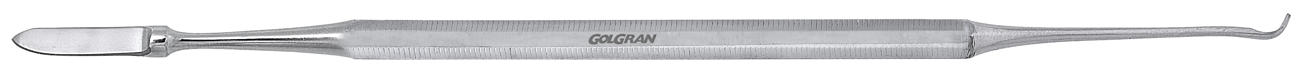 Instrumento duplo tendo o discoide para remoção de excesso de material e o cleoide como lâmina em forma de pá com característica específica para esculpir a anatomia oclusal.