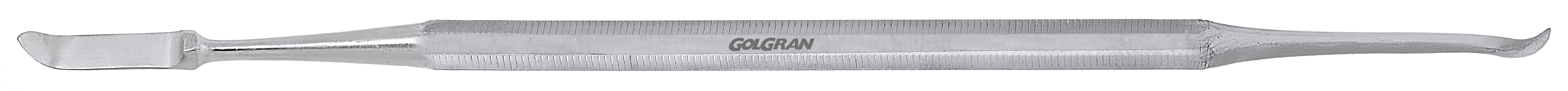 Instrumento duplo tendo o discoide para remoção de excesso de material e o cleoide como lâmina em forma de pá com característica específica para esculpir a anatomia oclusal.