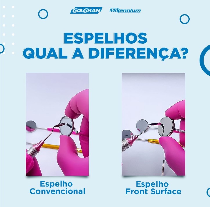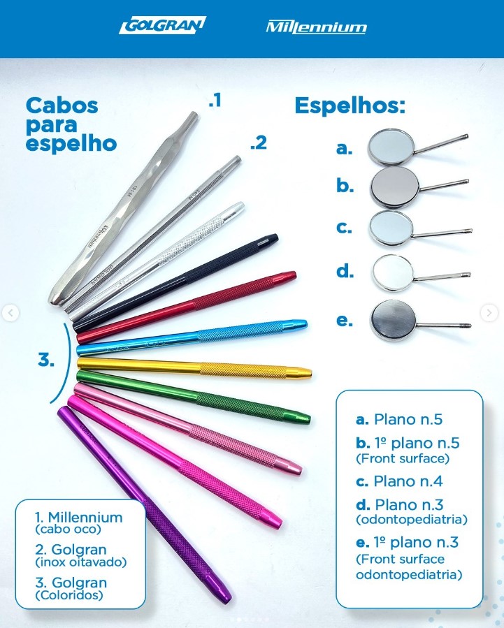 O espelho odontológico é um refletor de imagem, utilizado na visualização da arcada dentária. O espelho odontológico é rosqueado a um cabo feito em alumínio ou aço inoxidável. Cabo vendido separadamente, não sendo parte integrante deste produto. Limpeza e esterilização em autoclave, envelope de pano e esterilizados sozinho (Somente espelhos, não misturar com outros instrumentos).