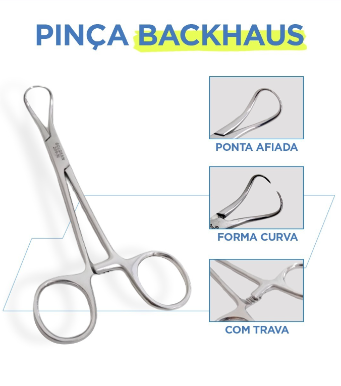 Ela tem a função de fixar os campos cirúrgicos (tecidos) estéreis para a realização da cirurgia. Com a ponta afiada, formato curvo e com a trava em cremalheira, a Pinça Backhaus é o instrumento ideal para prender com firmeza e segurança o campo cirúrgico durante o procedimento. Está disponível nos tamanhos de 8, 10 e 13cm.