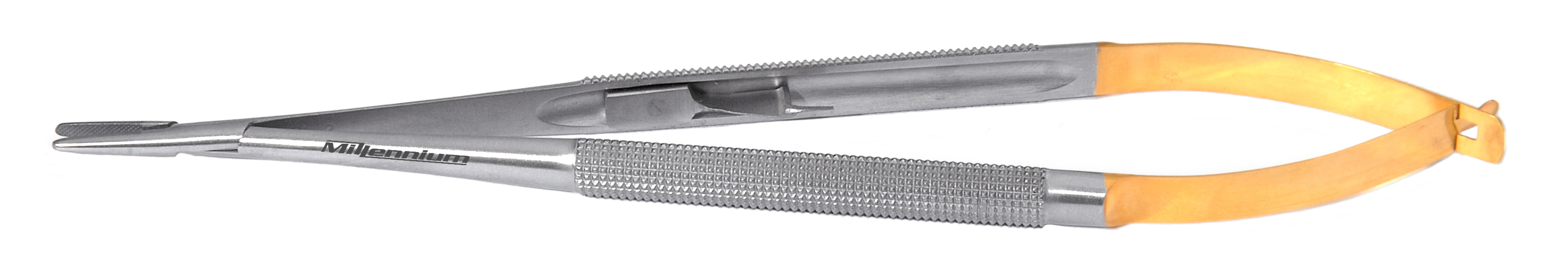 Utilizado para segurar a agulha e confeccionado com ponta delicada e revestido com pastilha de vídea oferece melhor acesso e maior segurança em microcirurgias.