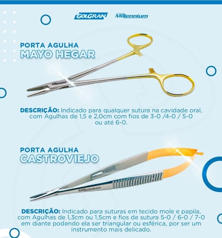 O Porta Agulha Mayo Hegar Auxilia na apreenção e manuseio do fio de sutura, é mais tradicional, possui argolas na pega e fenda na ponta ativa para um melhor encaixe da agulha no momento da sutura. Indicado para qualquer sutura na cavidade oral, com Agulhas de 1,5 e 2,0cm com fios de 3-0 até 6-0. Disponivel com e sem Vídea, 14 ou 17cm. "Você sabe o diferencial de um instrumento com vídea? A vídea é uma composição de metais duros e resistentes que é inserido na ponta ativa do Porta Agulha para que haja uma melhor fixação da agulha no instrumento, possibilitando uma sutura muito mais firme e segura. A Vídea também aumenta significativamente a vida útil do instrumento, e uma forma universal de saber se um porta agulha tem ou não é vídea é a cor do seu cabo, pois todo Porta Agulha com Vìdea tem o cabo dourado para fácil identificação do profissional."