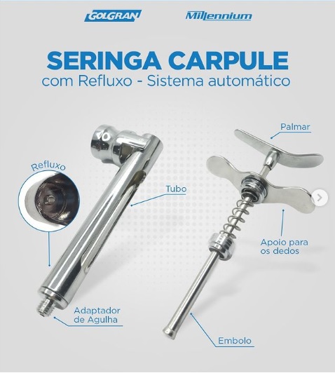 A Seringa Carpule com Refluxo Colorida da Golgran é usada em ambiente ambulatorial ou cirúrgico e auxilia o profissional na aplicação de anestesia dentária. Ela busca oferecer maior precisão e segurança na aplicação para evitar a injeção acidental de anestésico num vaso sanguíneo. Além disto oferecemos 6 opções de cores lindas, para alegrar o dia a dia do seu consultório.