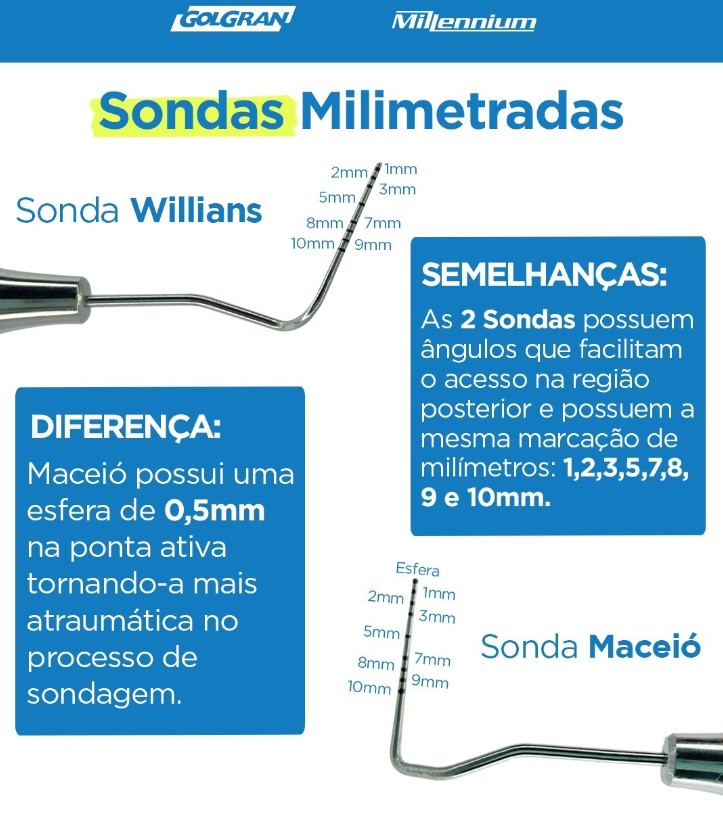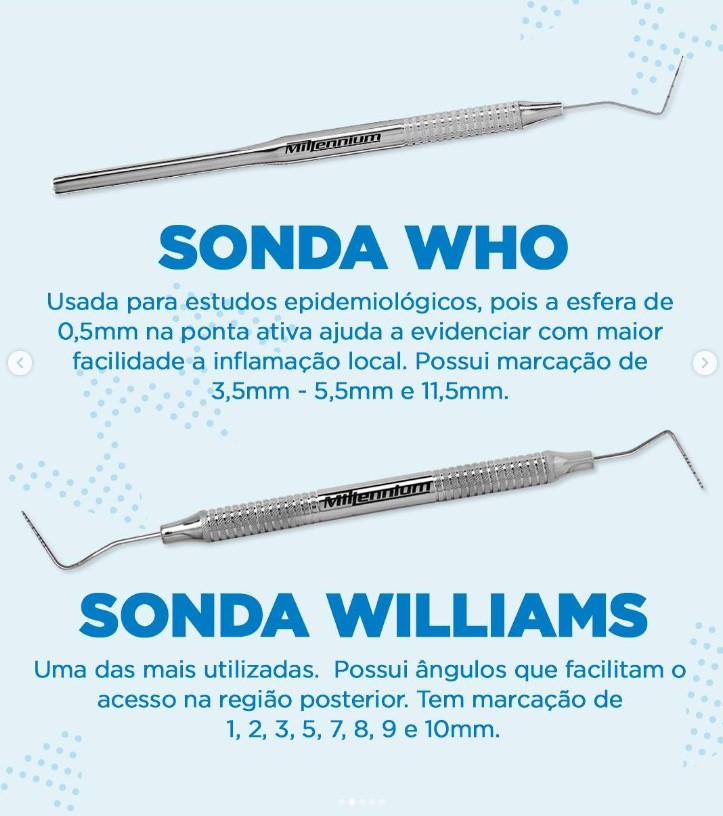 SONDA MILIMETRADA WILLIAMS MILLENNIUM é Utilizada em periodontia para avaliar a profundidade das bolsas, nível de ligação, configurações anatômicas e sangramento gengival. Uma das mais utilizadas. Possui as 2 pontas ativas anguladas para facilitar o exame periodontal em todos os sextantes, além das marcações a laser dos milímetros para melhor avaliação do nível de profundidade da bolsa gengival, com ângulos que facilitam o acesso na região posterior. Tem marcação de 1, 2, 3, 5, 7, 8, 9 e 10mm.